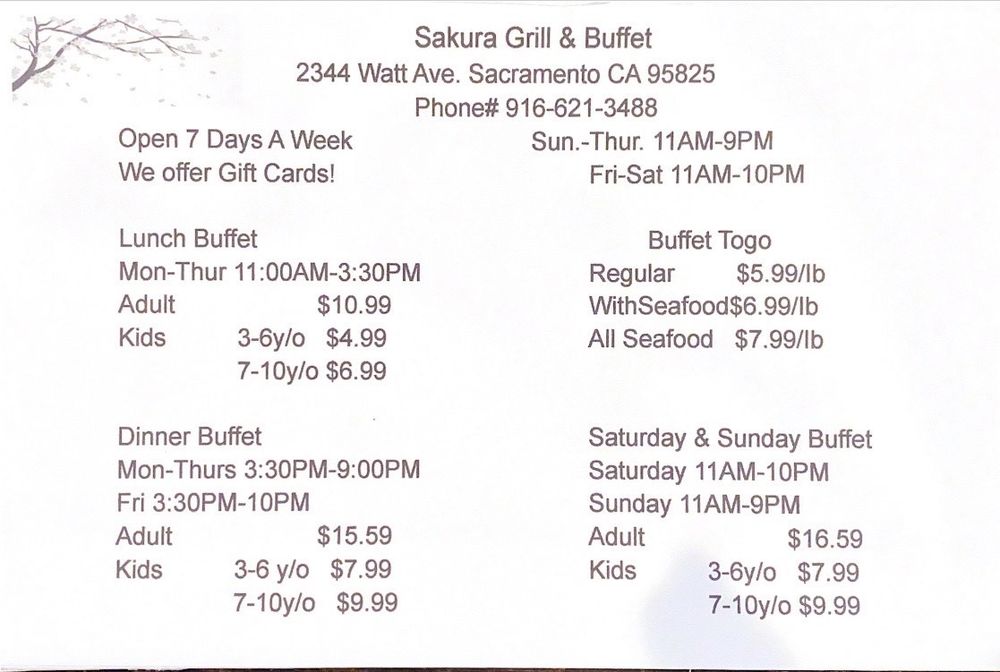 Sakura Grill & Buffet offers a diverse selection of Chinese and sushi dishes, catering to a variety of tastes. Located in Sacramento, CA, this restaurant provides takeout and delivery options, making it convenient for customers. With vegan and limited vegetarian options available, it caters to different dietary needs. The menu features fresh seafood dishes like the seafood boil, salt and pepper shrimp, and black bean clams, earning high praise for quality and taste. Although some dishes like the honey walnut shrimp may be too sweet for some, overall, the food quality is commendable. The casual ambience and fast, friendly service create a comfortable dining experience. Customers recommend trying out the Mongolian grill for a personalized dish and visiting on weekends for a broader selection. If you're in the mood for a casual buffet with a decent variety of dishes, Sakura Grill & Buffet is worth a visit.